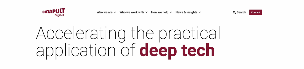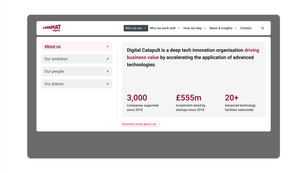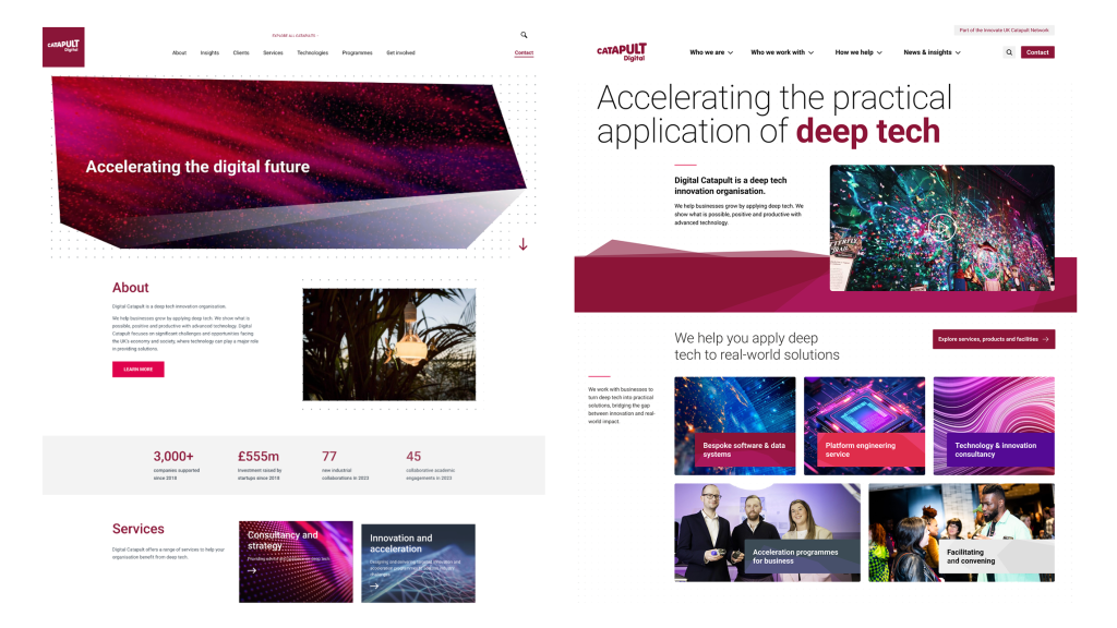 Digital Catapult had a cluttered, hard-to-navigate website that no longer reflected its brand or strategic goals. We helped them realign their website through targeted, high-impact design changes without touching the core codebase or structure.
